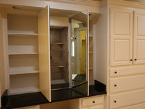 Both bathrooms feature mirrored doors revealing lighted cabinetry for a touch of luxury.